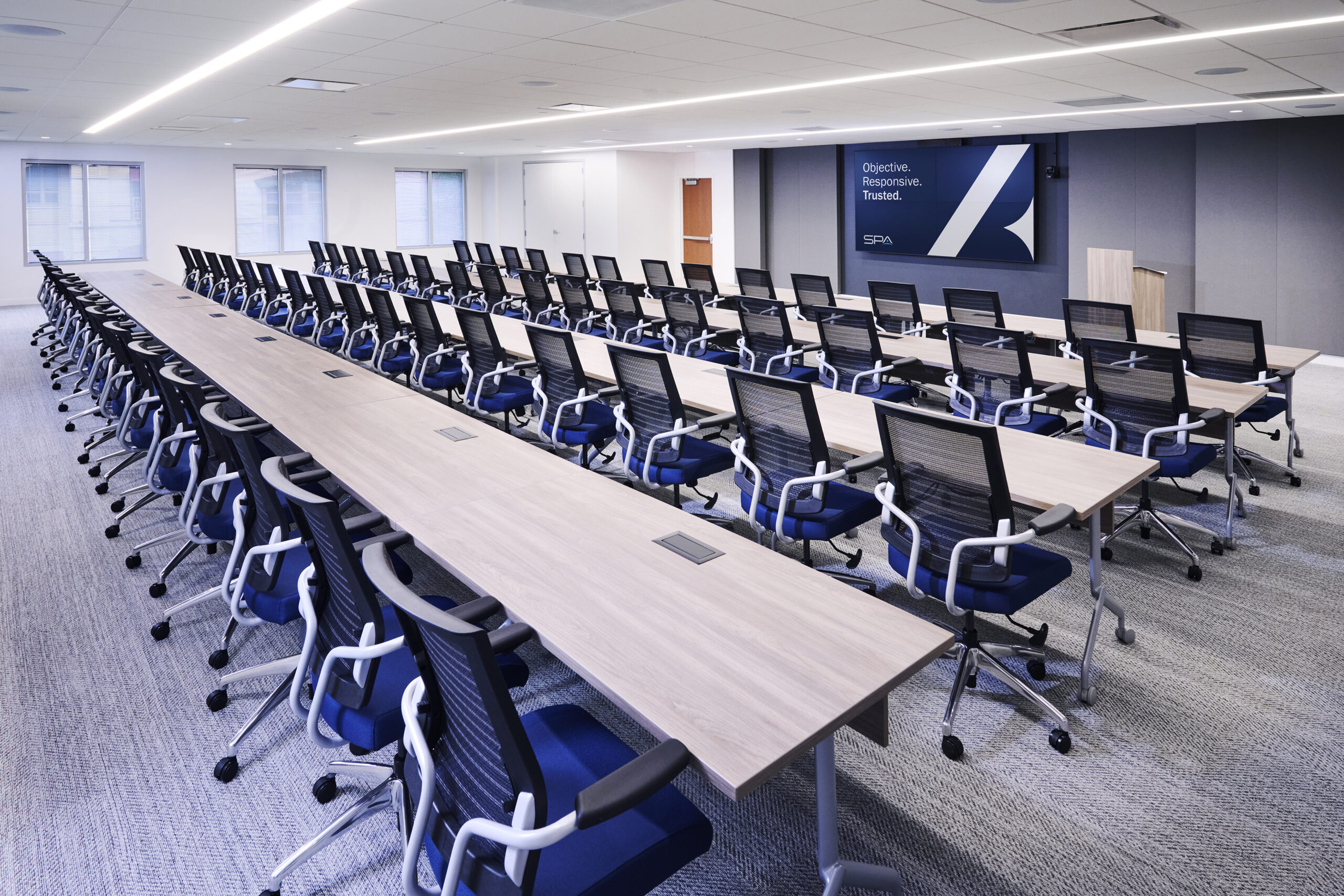 A modern intelligence programs office with large classified and unclassified conference rooms, reception area, unclassified seating, and rooftop entertainment.