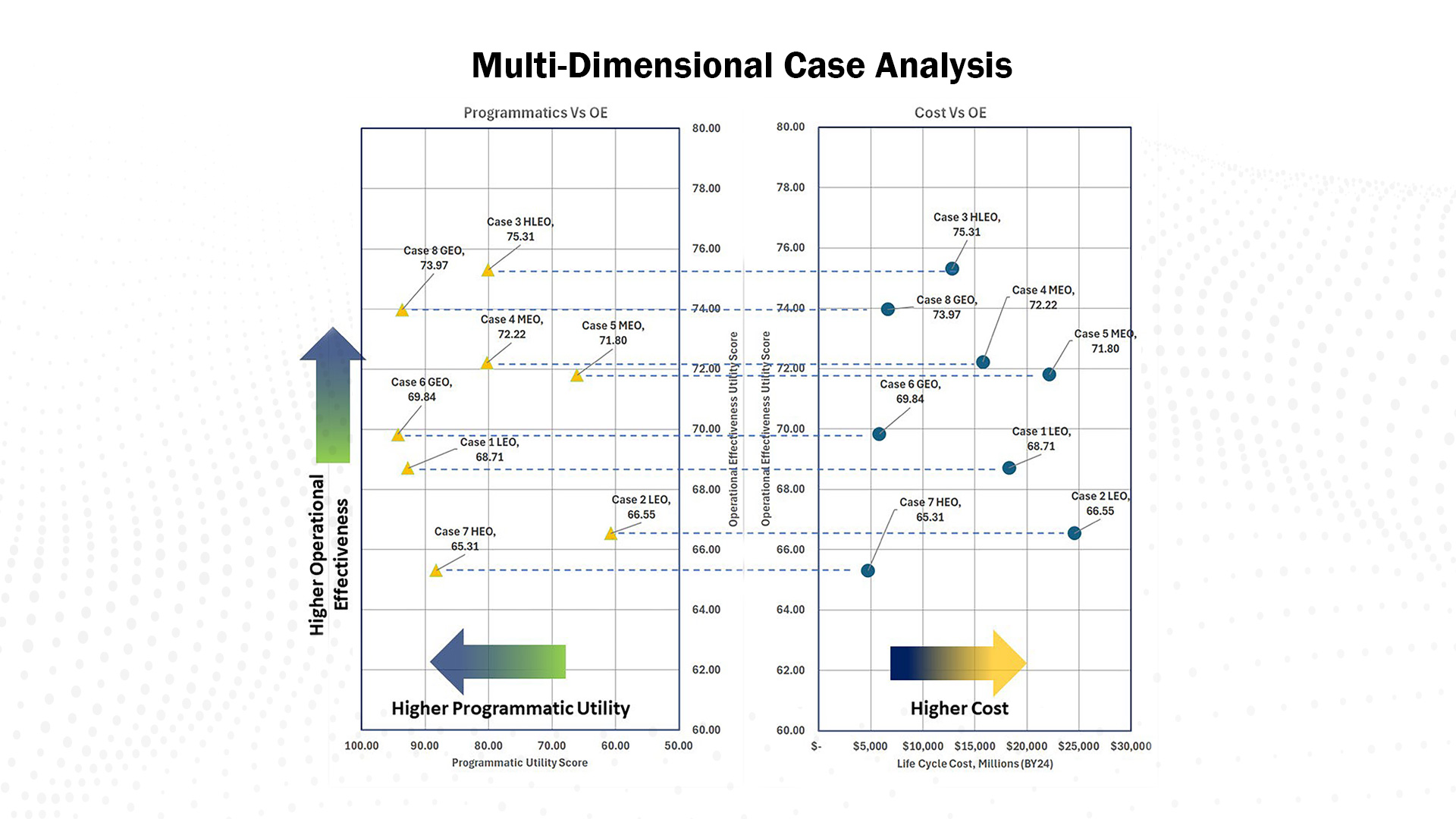 To help decision-makers grasp these trade-offs, we use visual models that plot utility (performance) against cost and optionally add a third axis for programmatic utility. The figure below shows how the top-ranked solution changes depending on whether the focus is purely technical, includes programmatic factors, or includes cost. This type of visualization does more than compare options—it illuminates execution risk in a way traditional AoAs cannot. That visibility is essential for program managers responsible for delivering capability on time and within budget. For that reason, it is ideal for briefings where multiple stakeholders need to understand the basis for trade-offs.